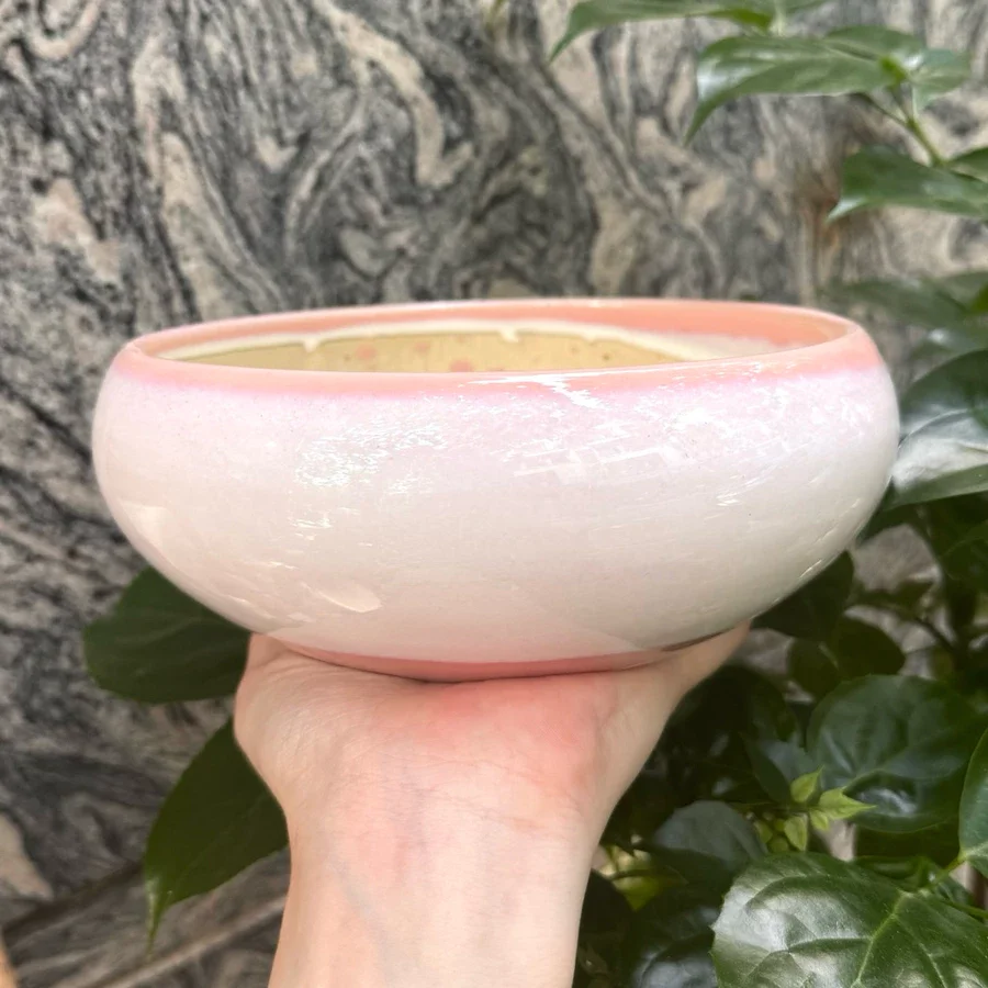 Chậu sứ ang tròn bo thiết kế dáng thấp, sang trọng. Lý tưởng trồng sen đá, xương rồng, tiểu cảnh & bonsai mini để bàn. Men bóng cao cấp