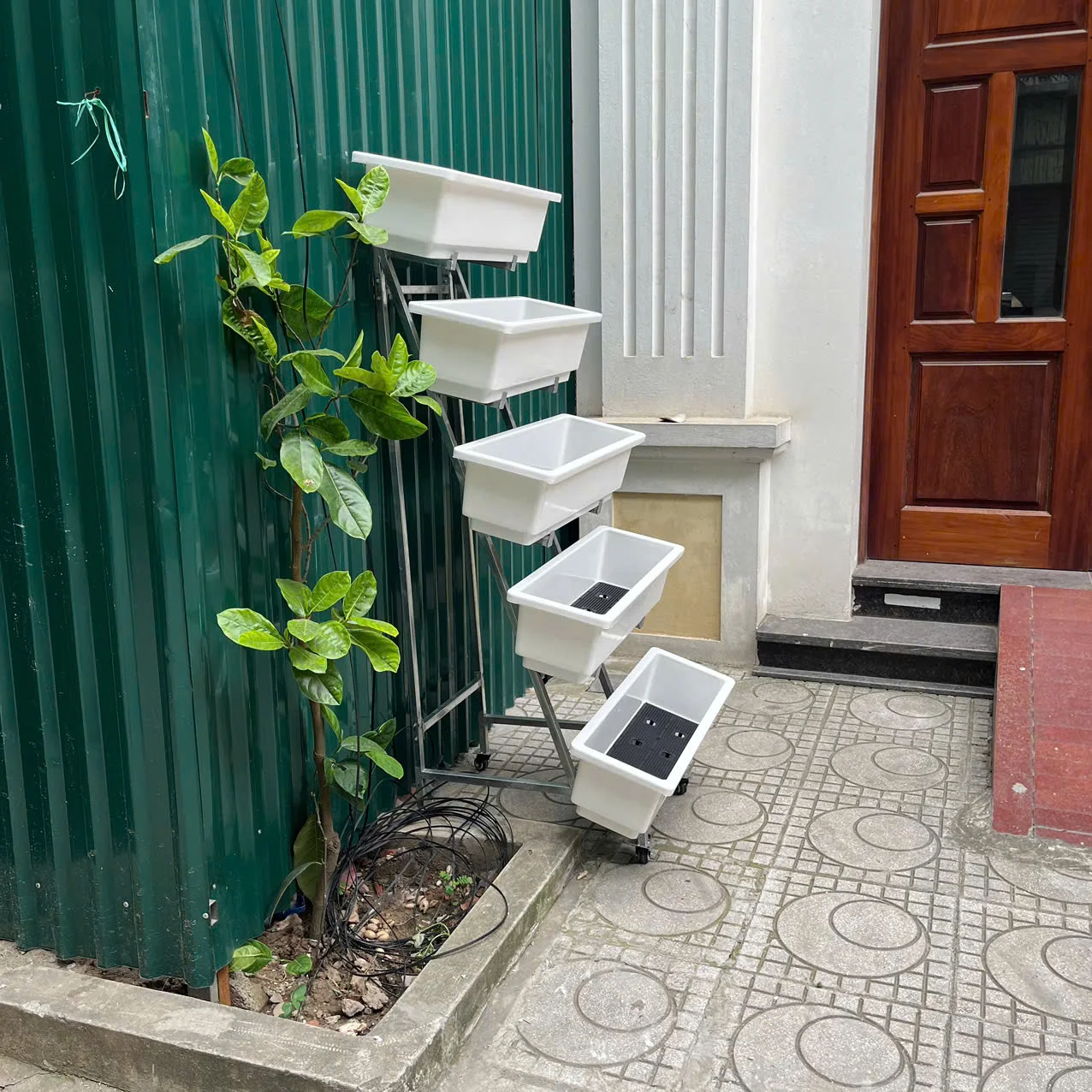 Thiết kế 5 tầng thông minh: Tăng diện tích trồng cây gấp nhiều lần so với đặt chậu rời.
